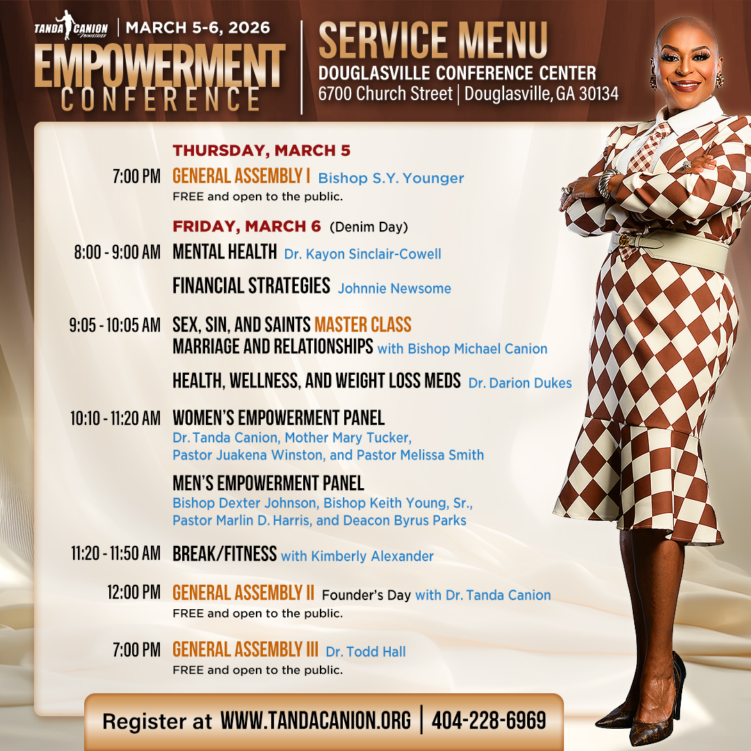 Dr. Tanda Canion has been a mentor who positively influences many lives around the world for decades. She is a prolific author of several books. She has transformed her experiences into impactful books titled PREACHER (A Practical Guide for Preachers and Ministers) and AM I TALKIN GOOD (Shaping the World with Words, Affirmations, and Prayers), aimed at inspiring readers. You will be the first to get your autographed copies at the Tanda Canion Ministries product table during the Empowerment Conference 2026.